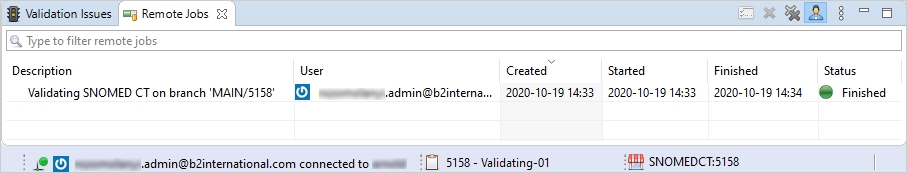 Validation is always executed on the active branch, which is why it is important to make sure that the right branch is active before performing the action. Running validation process is present as a job at Remote Jobs View. Here, it is also indicated that the validation has been executed on which branch. As per the example shows below the validation has been executed on the active task branch.