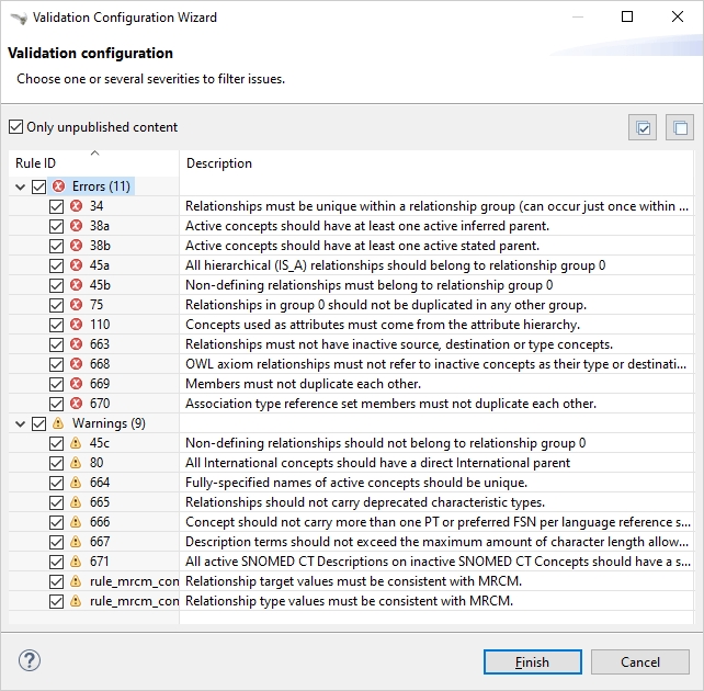Validation supports running rules by severity and turning specific rules on or off from the validation. These can be configured in a dialog that pops up after clicking on