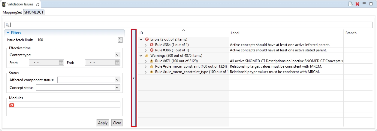 The Validation Issue View now highlights SNOMED CT Description term-related word violation errors (using a bold font style inside the affected component label). This is to help identify the reason why a description was reported under a specific rule (e.g.: spell-check or dialect rules).