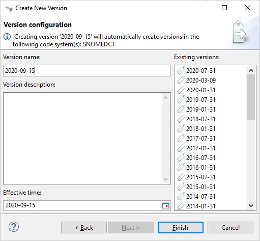 Enter a unique version name and a description. If applicable, existing versions are displayed in the section to the right.