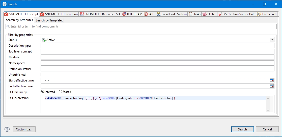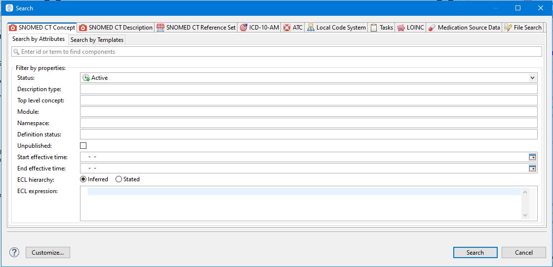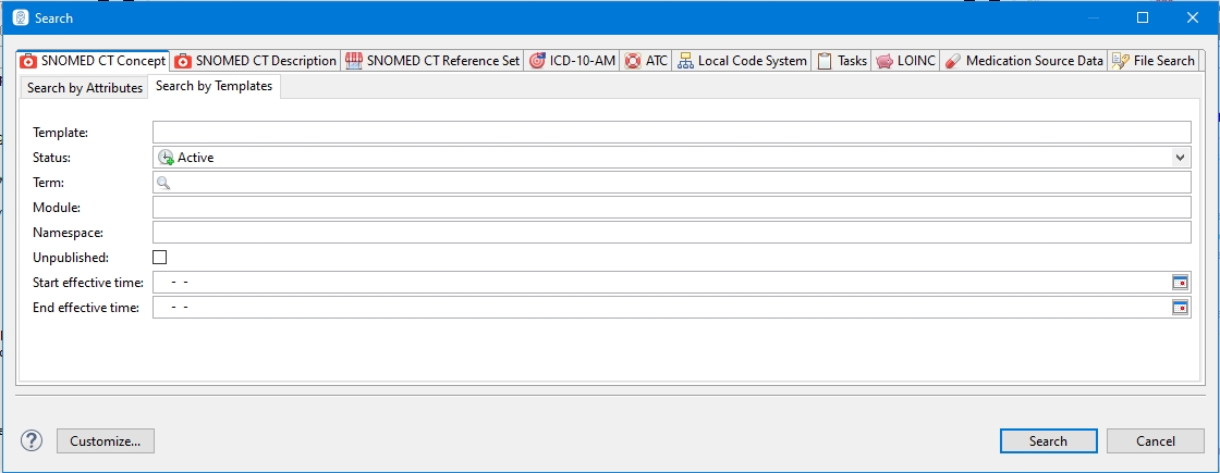 The Search by Templates tab can be used to execute a query based on the concepts created with a SNOMED CT Template.