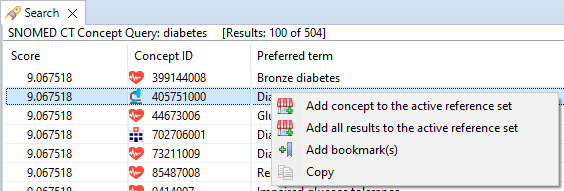 Right-clicking on a concept in the result list the Context Menu reveals the following actions.