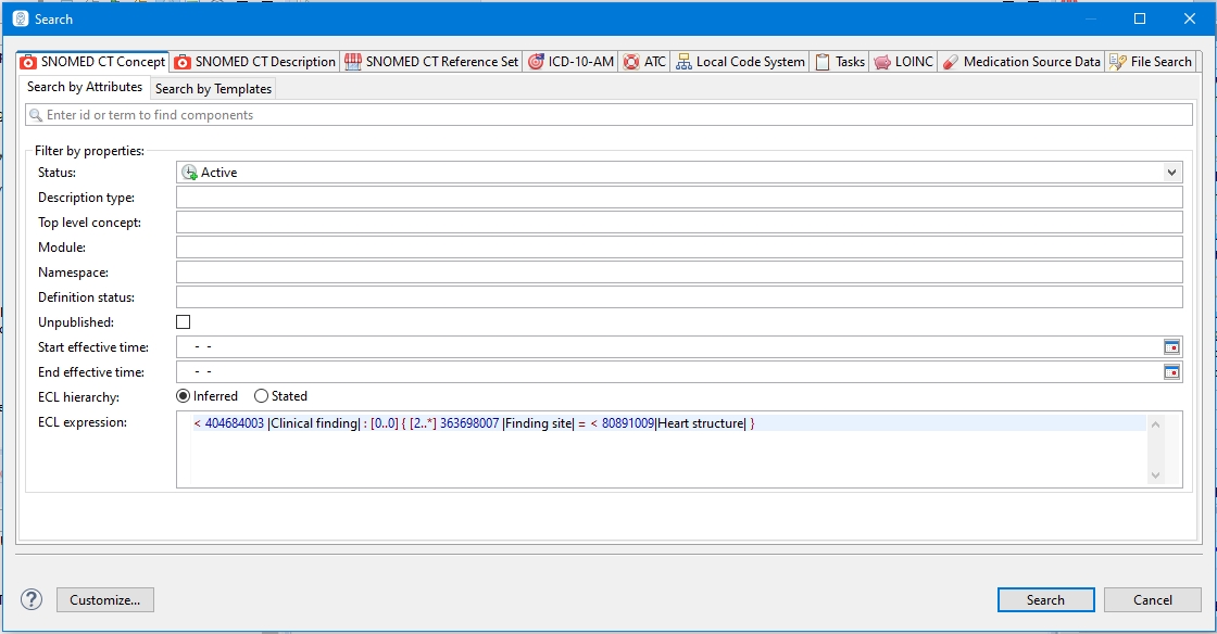Open SNOMED CT Concept Advanced Search by clicking the flashlight icon in the application's main toolbar and selecting ECL expression.