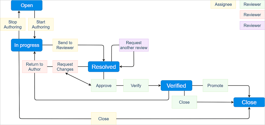 Task is sent for review β task status is Resolved as fixed. An author can select reviewers, or reviewers can self-select themselves for tasks that are resolved.
