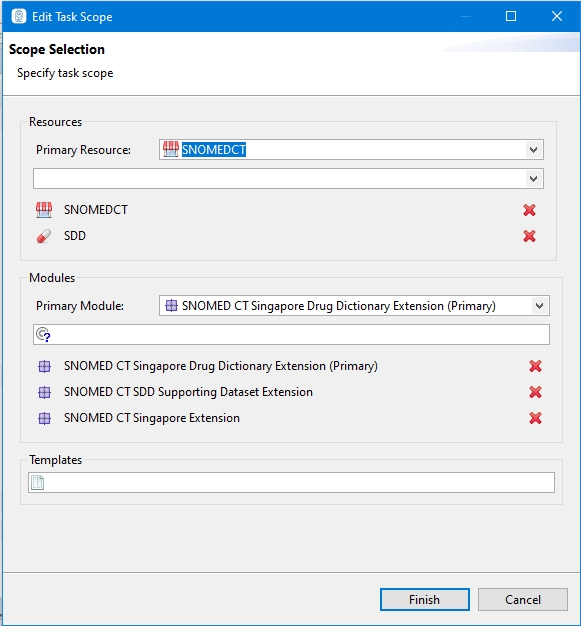 It is now possible to modify the scope of an existing SNOMED CT task in a designated wizard in which users can change the primary resource and module setting as well.