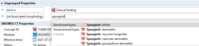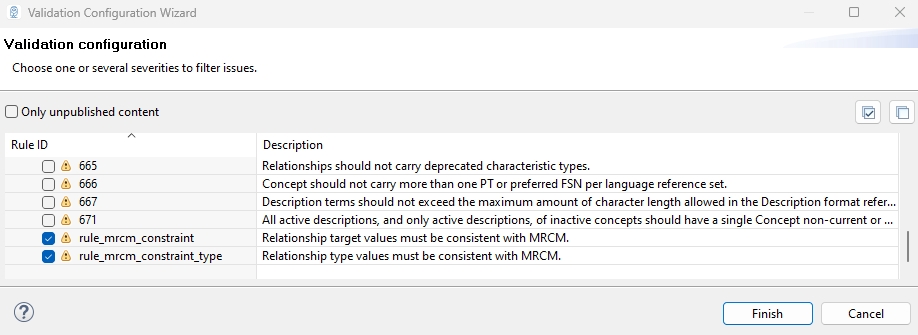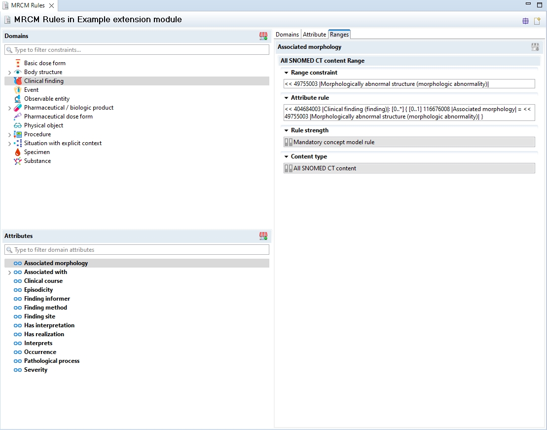 In addition to guiding the authoring process of new concepts, MRCM rules can also be used to validate existing content. The MRCM constraint and MRCM constraint type rules, selected below, verify if an attribute type is used within its prescribed domain(s) or if an attribute range is used by its associated attribute type(s) as per the MRCM rules.