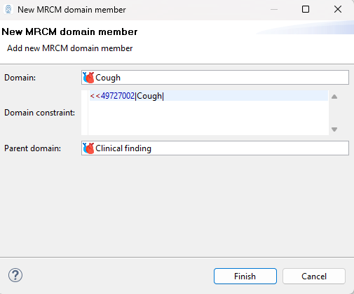 Add new domain member button in the top right corner of the Domains section. It will open the wizard below. The first field will let you choose the referenced concept of the domain Member. The second field will let you specify an ECL expression to define this domain. The third field allows you to select the parent domain.