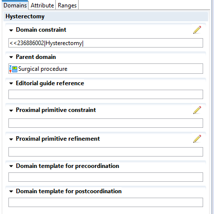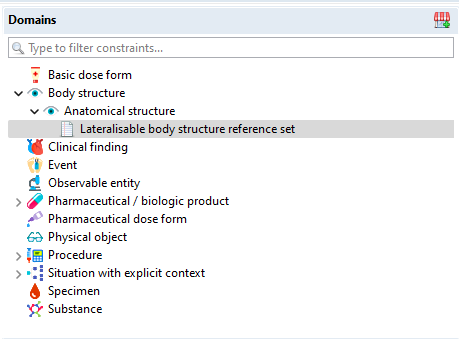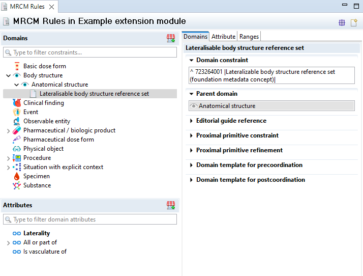 The tree on the top left quadrant of the editor represents all the domains for which an MRCM rule is defined. The child nodes of a domain node represent domain definitions that are subsets of their parent domain node. The domain nodes correspond to the referenced component of the in-scope MRCM domain reference set. The referenced component is usually a concept at the top of a hierarchy or a reference set.