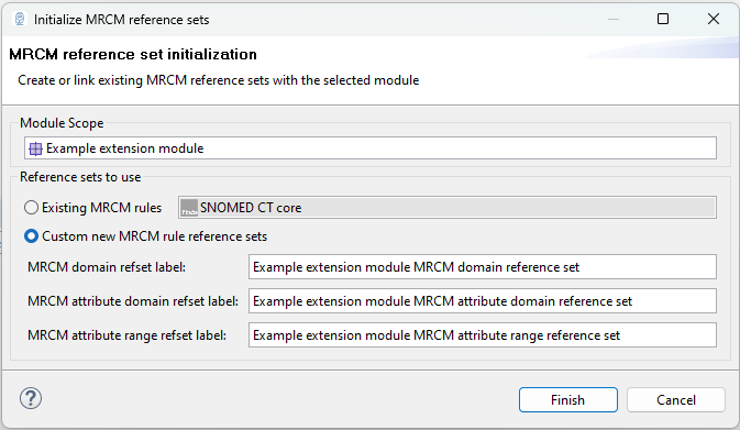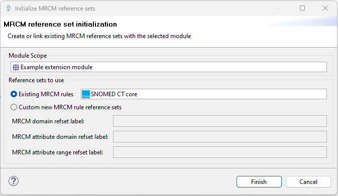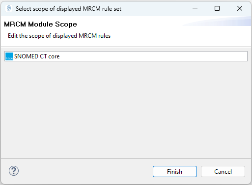 The resulting wizard will let you choose from modules that have been added to the Module scope reference set (in our example SNOMED CT core and Example extension module). After hitting Finish, the MRCM editor will be updated with content from the MRCM rule reference sets corresponding to the chosen module within the Module scope reference set.