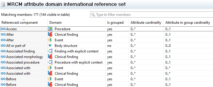 Allowed attributes for a given domain are represented by members in MRCM attribute domain reference sets. The referenced component of an attribute domain member is a concept from the Attribute hierarchy. Each domain that an attribute is allowed in is denoted in a separate member by the Domain field. The exact domain constraint is defined by the MRCM domain reference set member referencing the concept in the Domain field.