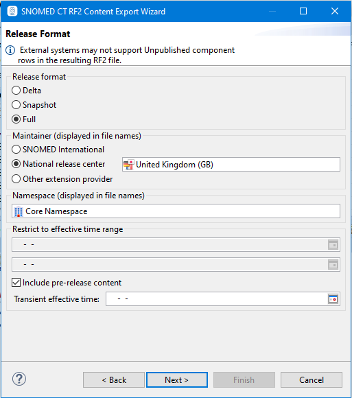 <figure><img src="https://content.gitbook.com/content/N7ynFOLTw3W9Zow9AaAJ/blobs/dxj9PI3w0gqKtQhcZr4V/image.png" alt=""><figcaption><p>SNOMED CT RF2 Content Export Wizard – release format and effective times</p></figcaption></figure>
