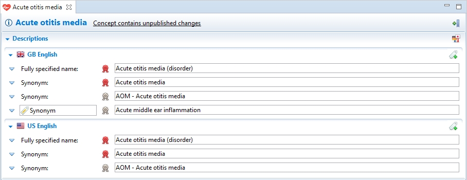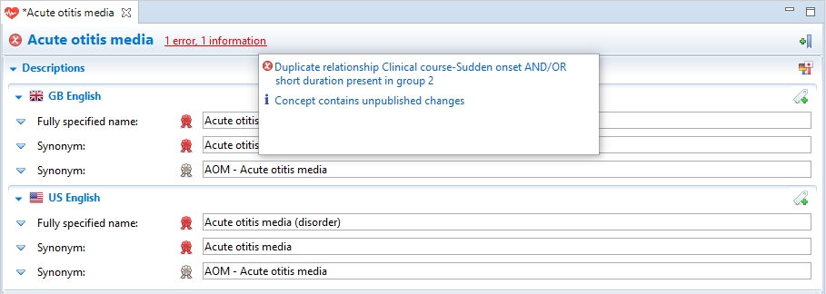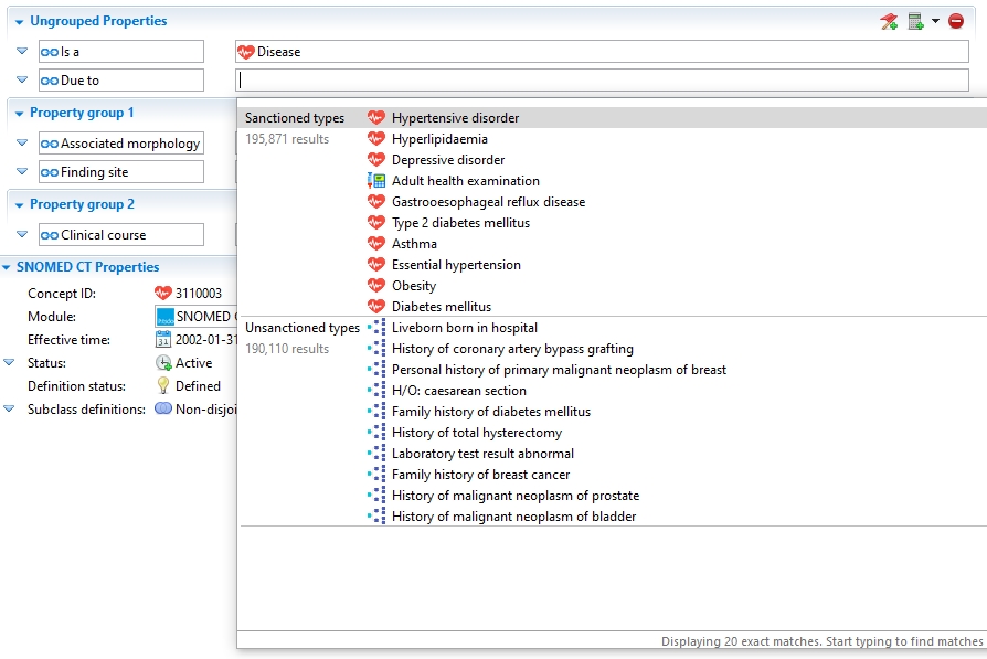 When a new relationship is added, values for the attribute type and the target concept are classified either as Sanctioned or as Unsanctioned. Sanctioned means that those values are valid based on the Machine Readable Concept Model (MRCM), while Unsanctioned values are invalid based on MRCM rules.