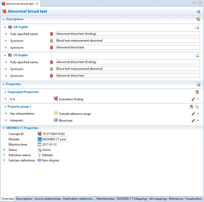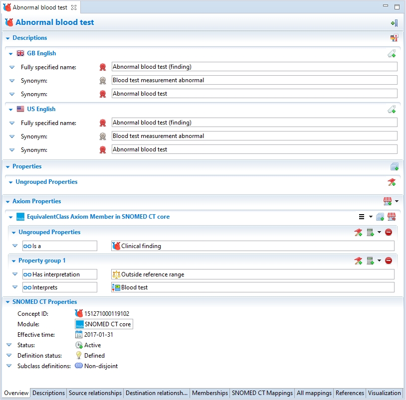 Switching between the two different modes changes the SNOMED CT Concept Editor to display stated and additional characteristic types in authoring mode, or inferred and additional characteristic types in browsing mode. When authoring mode is selected, the editor allows modifications to the concept by enabling the addition of both sanctioned and unsanctioned attributes. The attribute editing fields are powered by the Machine-Readable Concept Model (MRCM), where for any particular concept domain, various attribute and concrete domain constraints are specified. The editing is not limited to pre-defined attributes only, users can always deviate from the model if necessary.