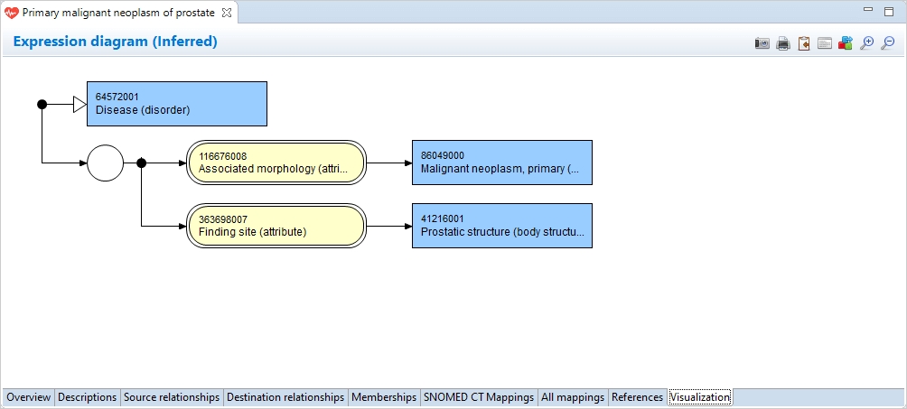 The Visualization Page displays the diagrammatic representation of the definition of the given concept. Concepts are represented on the diagram by their Fully Specified Name and their identifier. The definition diagram is displayed by default, however, you can switch between definition and expression diagrams using the toolbar icon. Both representations can be rendered by either stated or inferred relationships toggled via the universal Authoring button in the application's main toolbar.