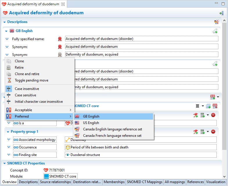 Click the blue triangle in front of the term you would like to change the acceptability of to bring up the Context Menu. Choose Preferred, then select the desired Language Reference Set from the list.