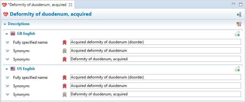 Each Fully Specified Name and Synonym has a rosette icon, a red icon means that the description is preferred in the specific language reference set, while a grey icon means that the description is acceptable.