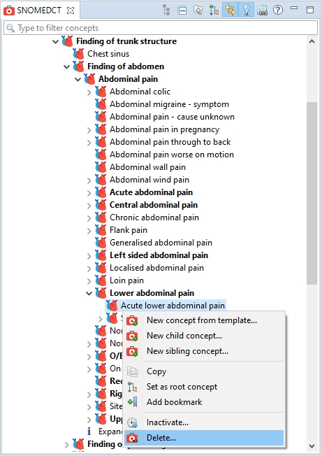 Right-click the concept in the SNOMED CT View and select Delete concept from the Context Menu.