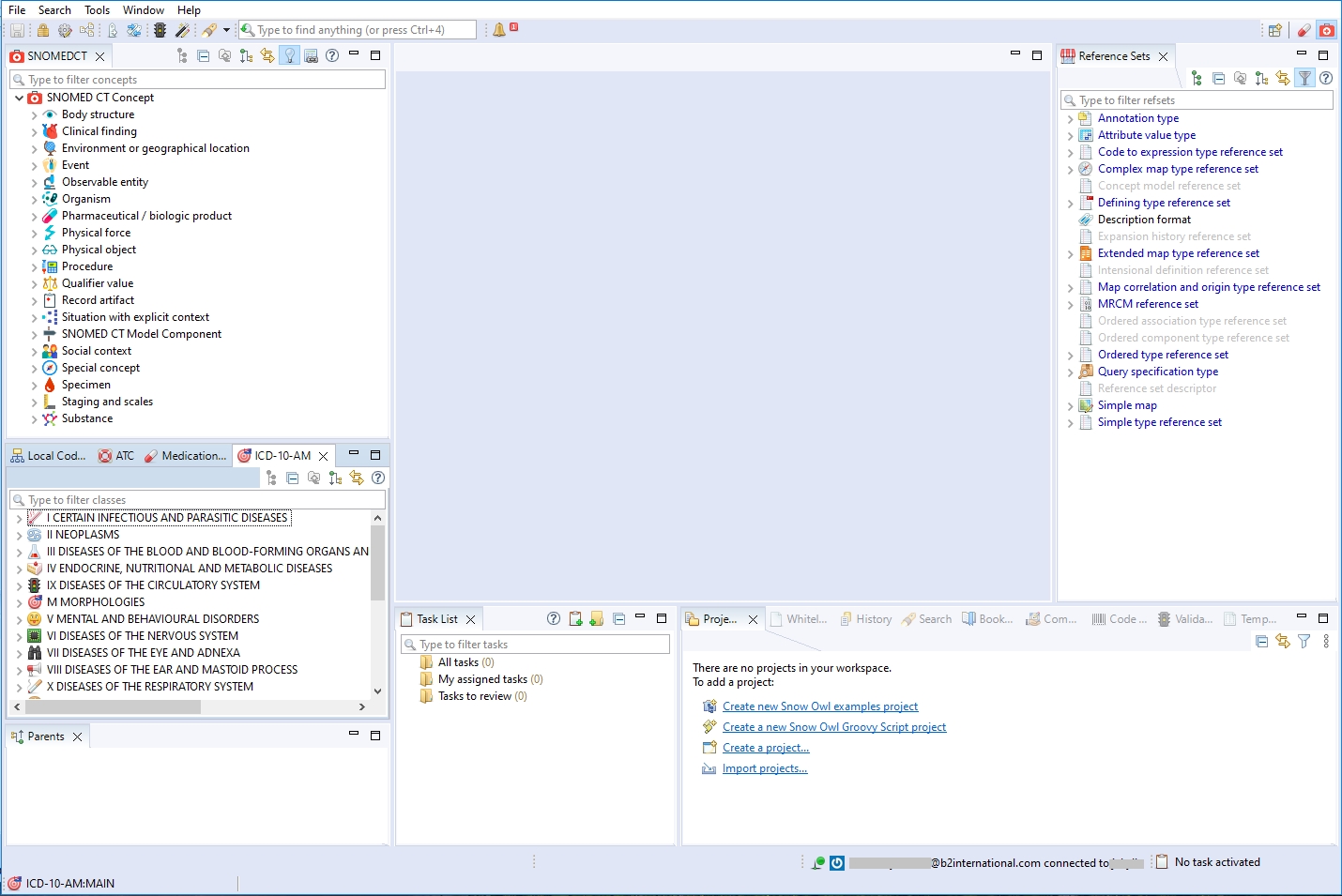 When you open Snow Owl for the first time you will be presented with the Authoring Perspective, which is the default layout. It contains menus, toolbars, and two different kinds of sections: editors and views.