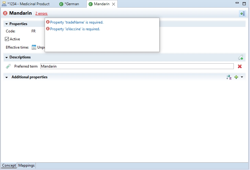 button reveals a Context Menu with all the properties defined for the Local Code System with the applicable properties enabled. Properties can be removed by pressing the button next to the property. Property values are validated against the validation expression configured for the corresponding definition set on the Local Code System.