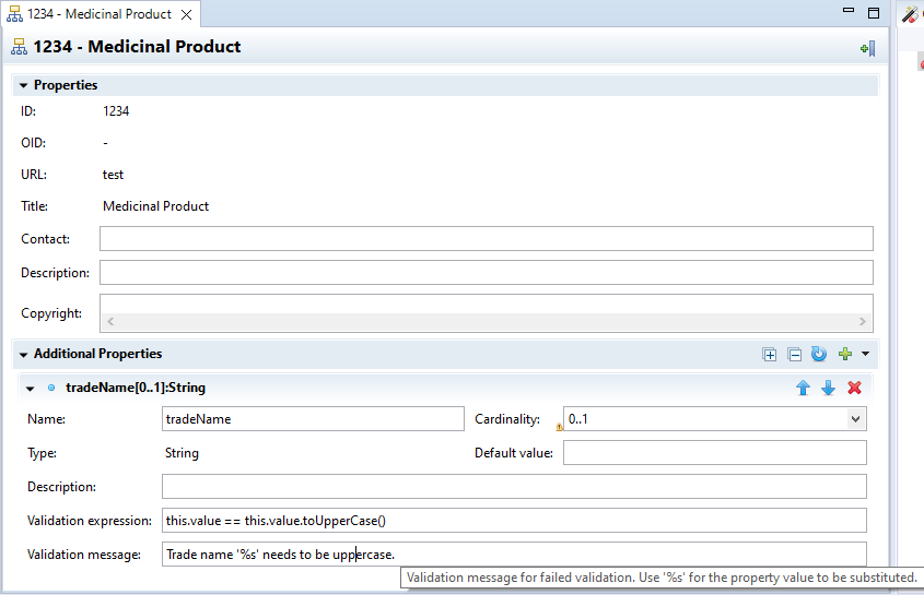 Validation message: Validation message in case invalid property value entered (the validation expression evaluates to a