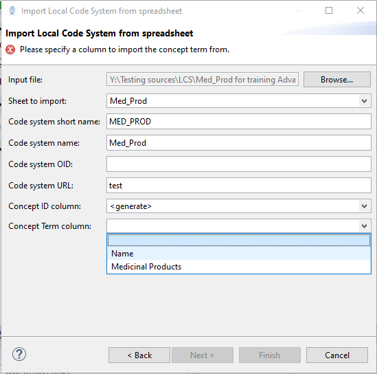 Code system OID: Local Code System metadataCode system URL: Local Code System URLConcept ID columns: Excel column containing the IDs of the codesConcept Term column: Excel column containing the terms of the codes