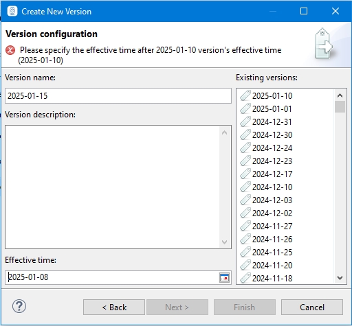 You can only specify a date that is later than the (date of the latest) previous version. An error message will inform you in this case.