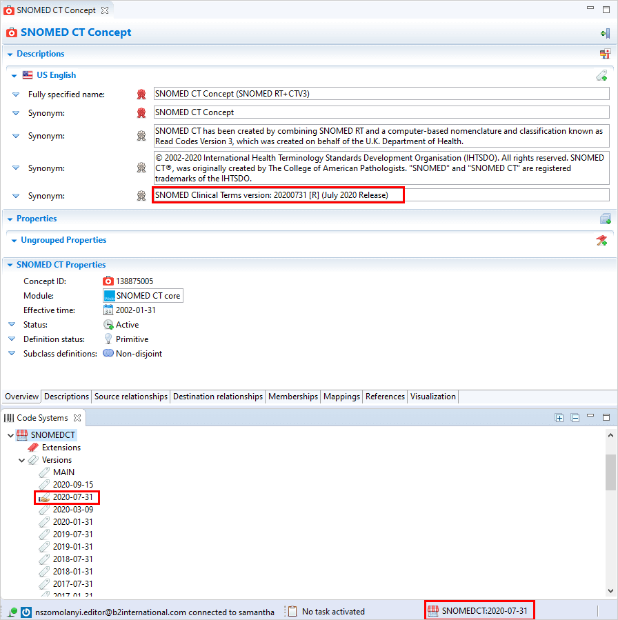 A way to verify that you are working with the selected release is by opening the root concept in the Concept Editor where the information about the version is listed as a synonym. It is also indicated in the Code Systems View and on the Status Bar.