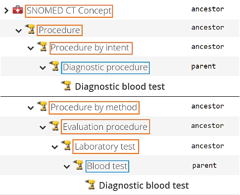 Compare the output with a rendering from a user interface, where the concept appears in two different places after exploring alternative routes in the hierarchy. Parents are marked with blue, while ancestors are highlighted with orange: