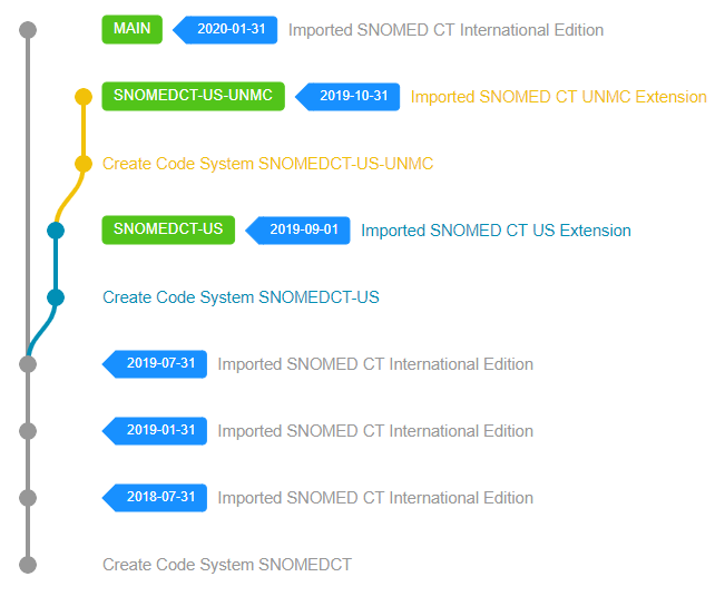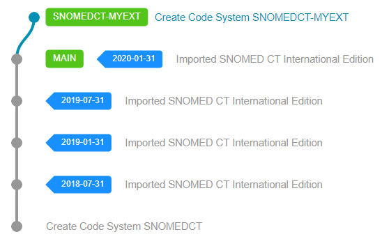 If your Extension needs to extend another Extension and not the International Edition itself, then you need to identify the version you'd like to depend on in that Extension (that indirectly will select the International Edition dependency as well). When you have identified all required versions, then starting from the International Edition recursively traverse back and repeat the RF2 Import and Code System creation steps described in the previous section until you have finally imported your extension. In the end your extension might look like this, depending on how many Extensions you are depending on.