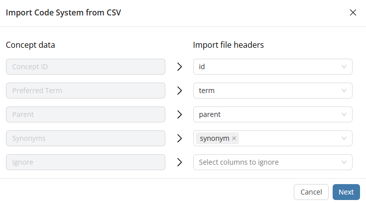 Once the structured data source has been configured, Snowray offers a step in the wizard flow to configure how the system will map the columns to the Code System concept model.