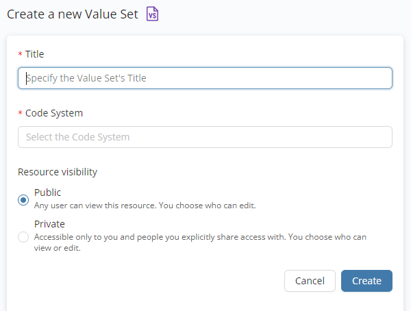 resource button reveals the Create a new Value Set form in place of the resource type selection panel. Once the required fields are populated, users can proceed with generating the Value Set by pressing the