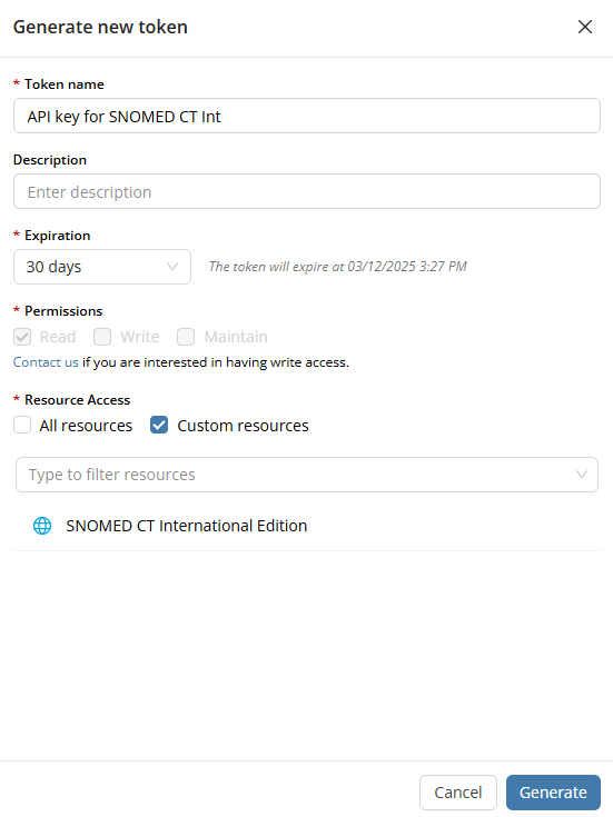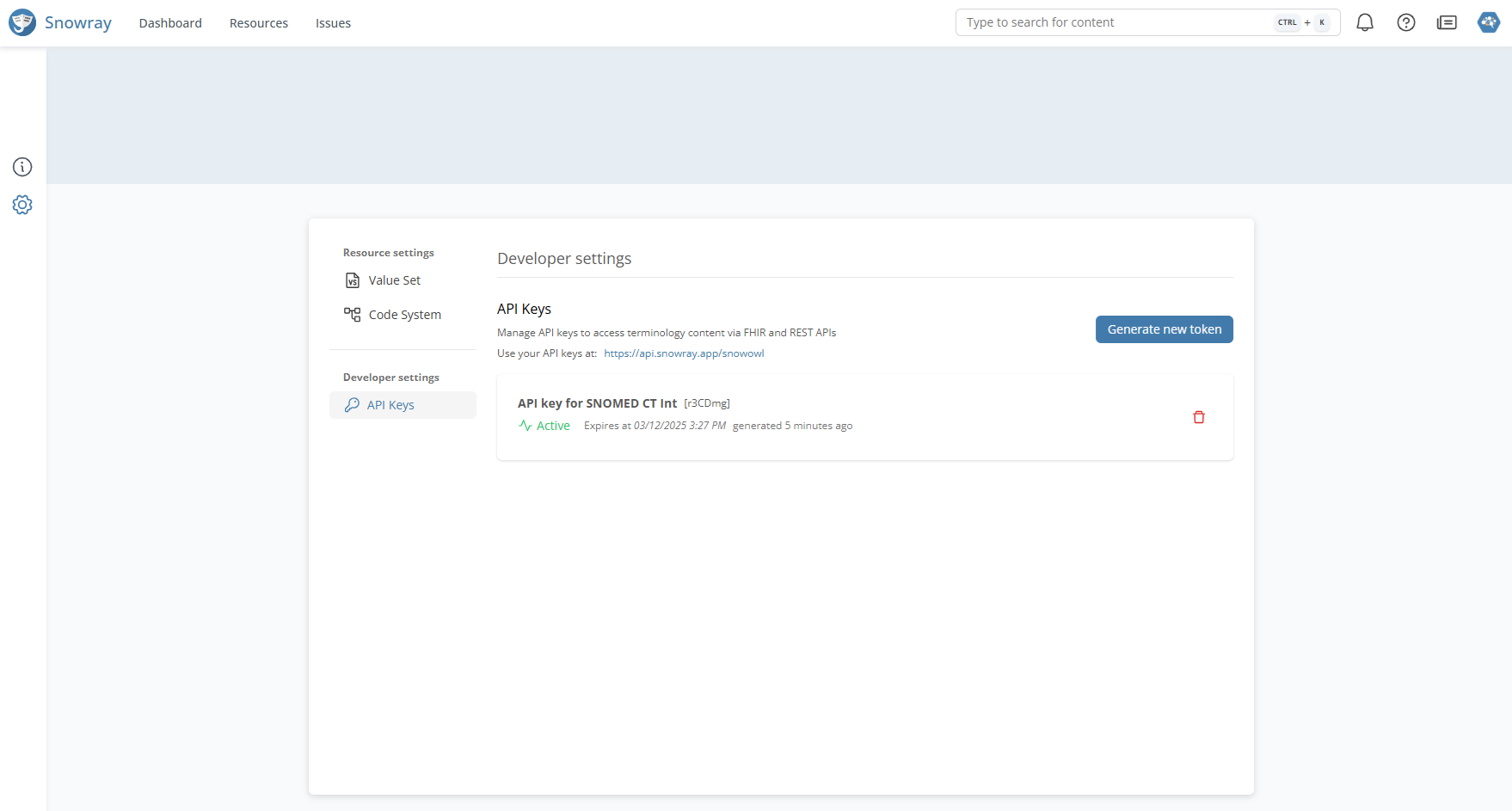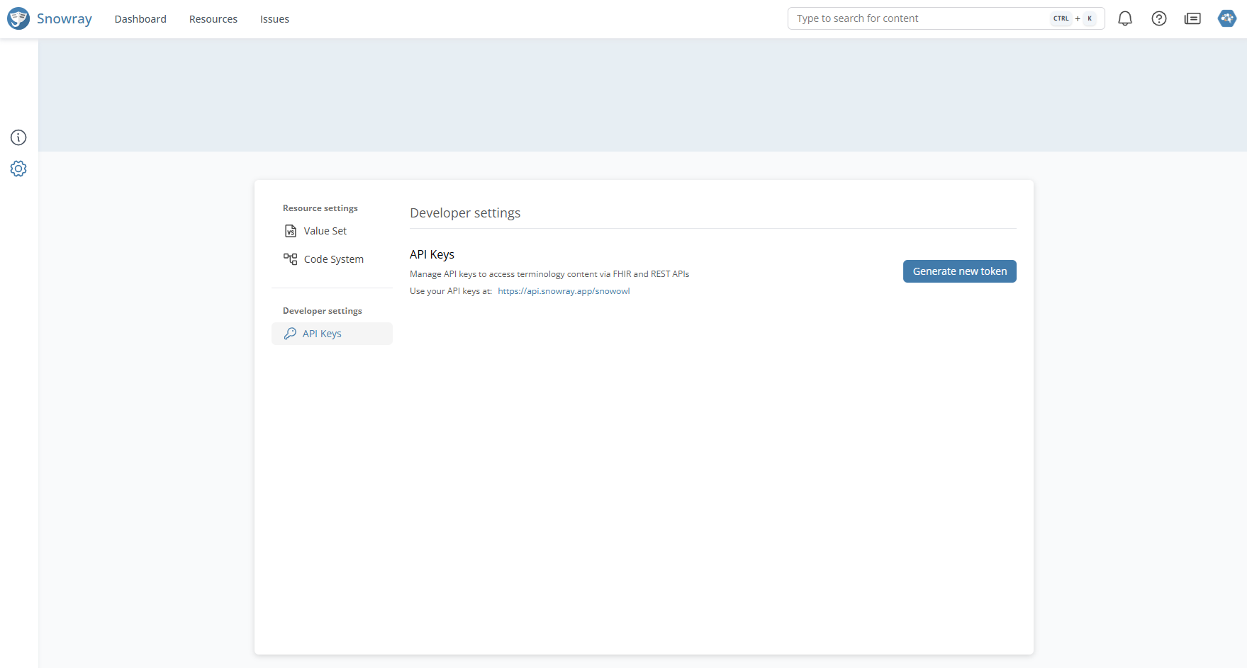 | **API Keys** | Generate and copy a token to access terminology content via FHIR and REST APIs. |