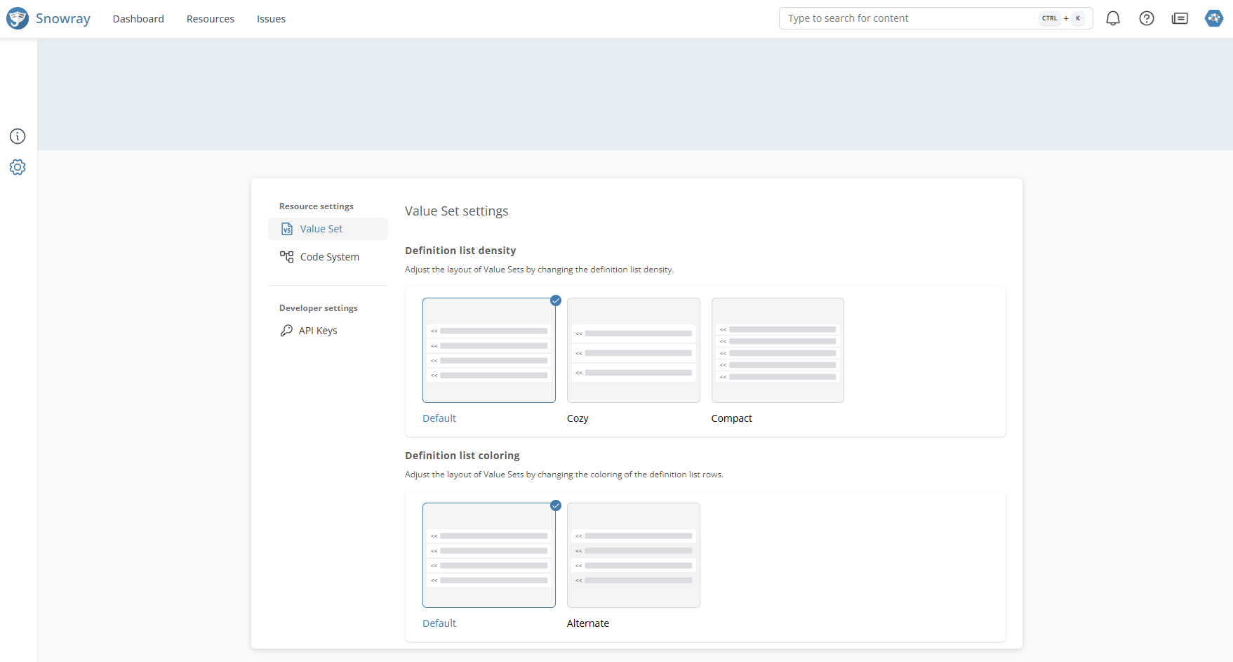 | **Definition list density**  | Default, Cozy, Compact | Adjust the layout of Value Sets by changing the definition list density              |