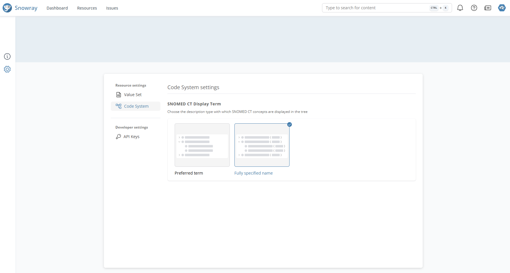 | **SNOMED CT display term** | Fully Specified Name, Preferred Term | Choose the description type with which SNOMED CT concepts are displayed in the tree |