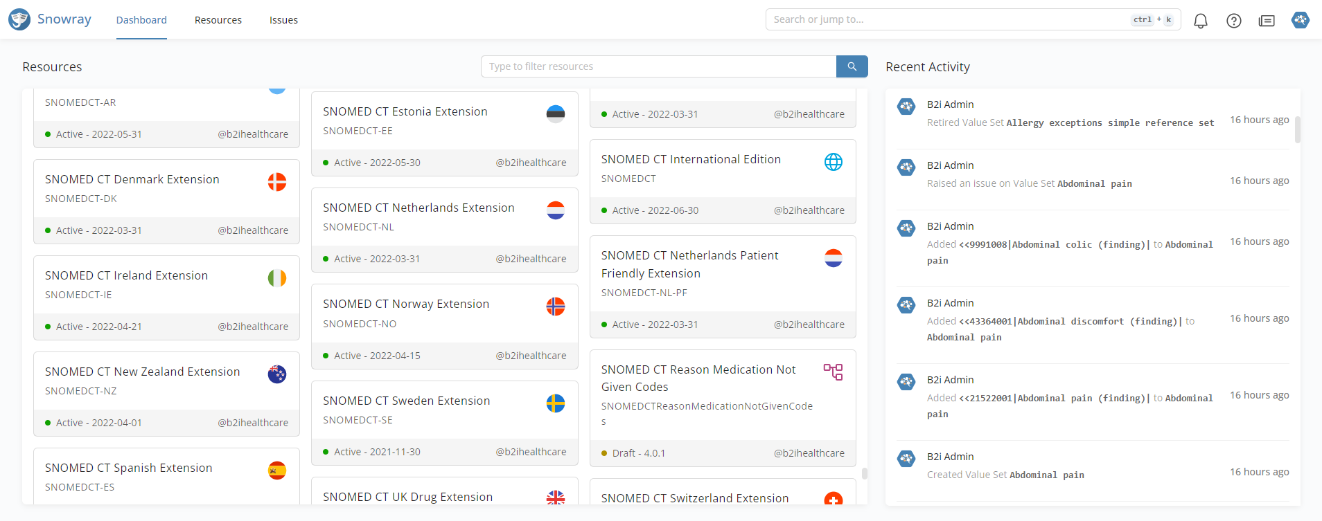 Concept Maps) that are available in Snowray. Each resource has its own card with additional information showing the resource's title, id, status, version tag - where applicable-, as well as the owner of the resource.