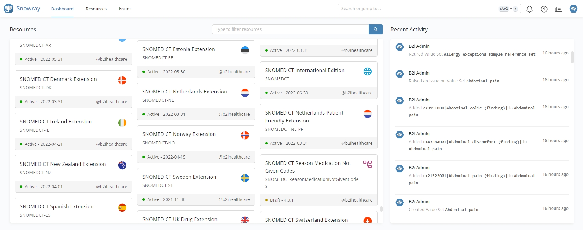 The Dashboard displays all the created or imported resources (Code Systems,