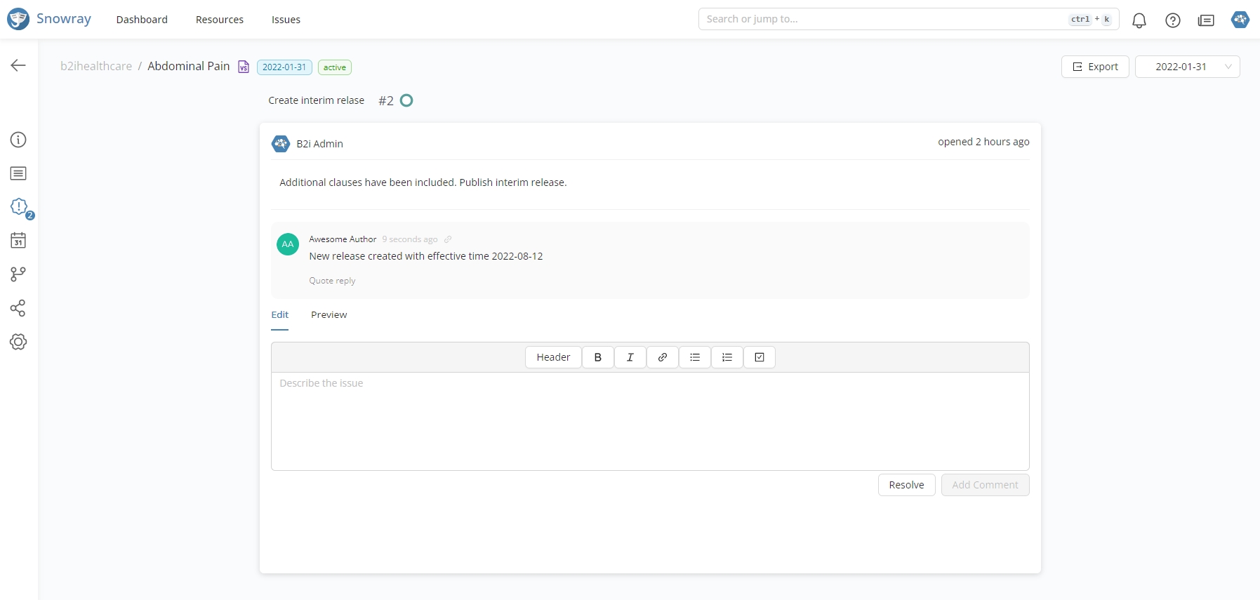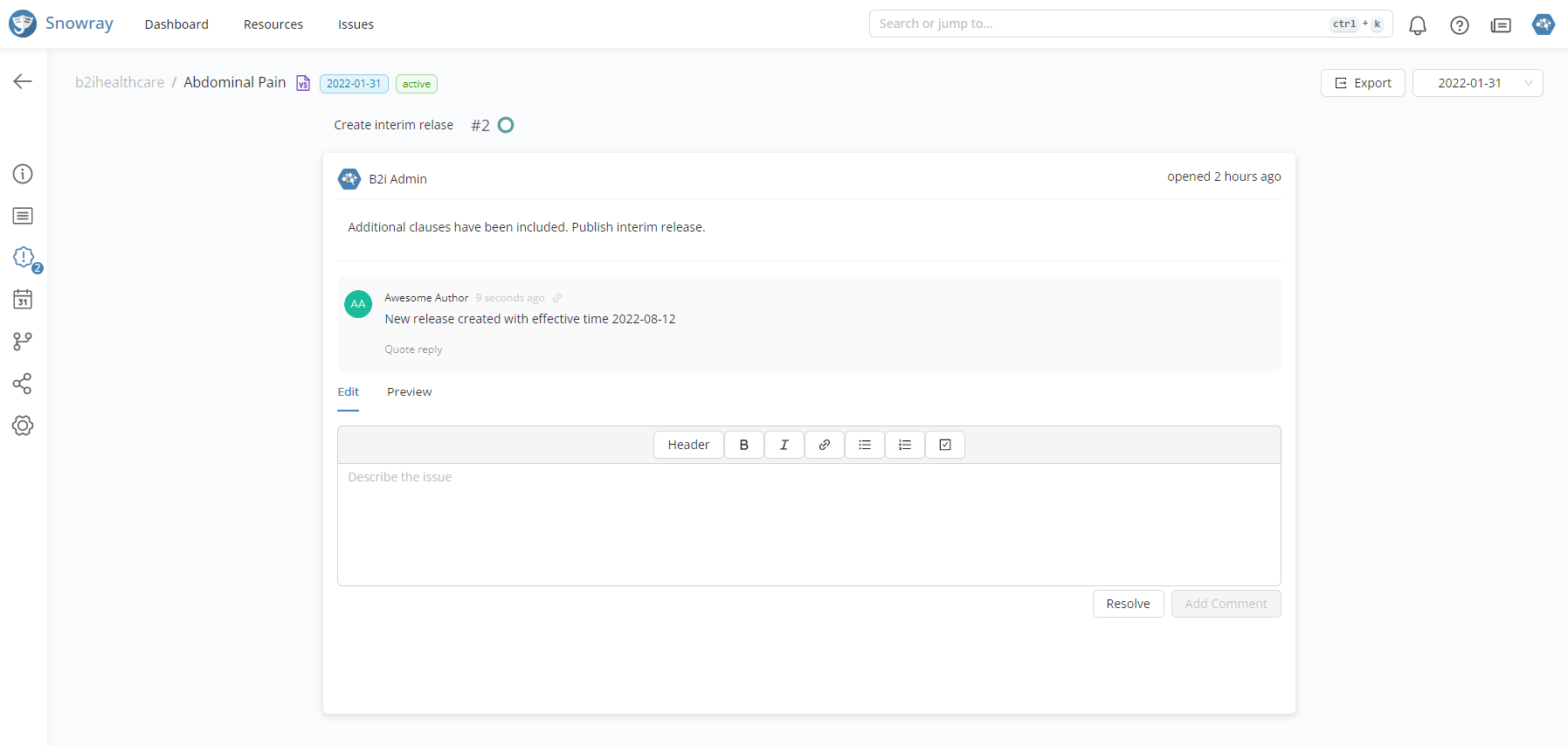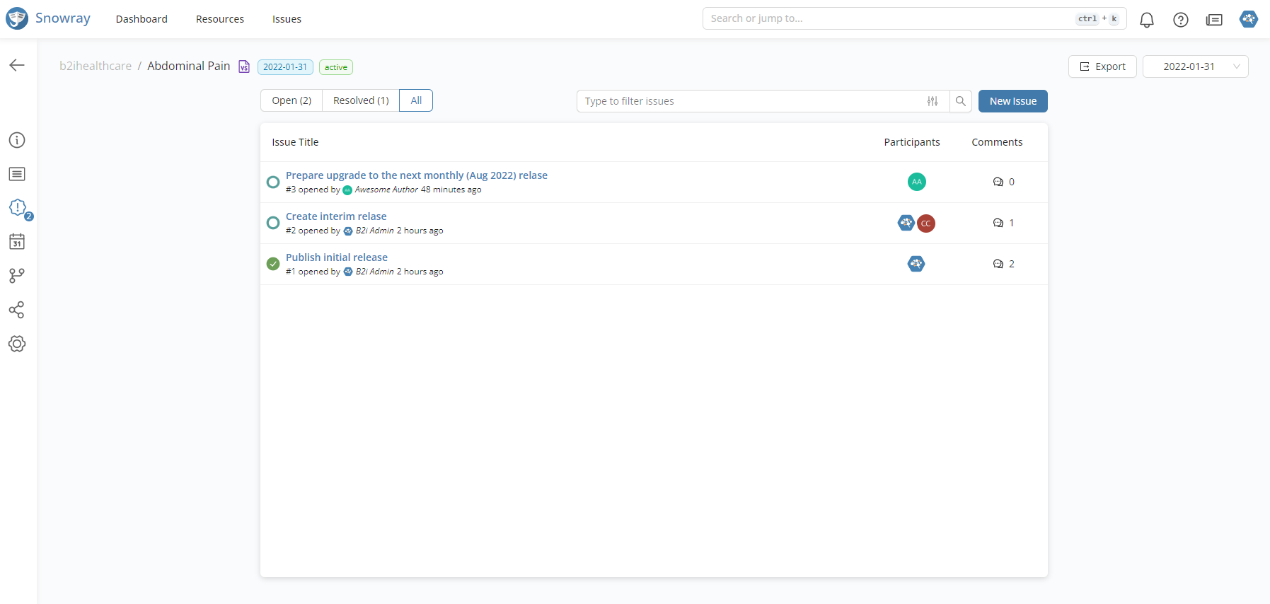 Users can leave comments, suggestions, and other feedback they encounter during authoring in the form of issues. These can be created for specific resources and are maintained on a dedicated page called Issues.