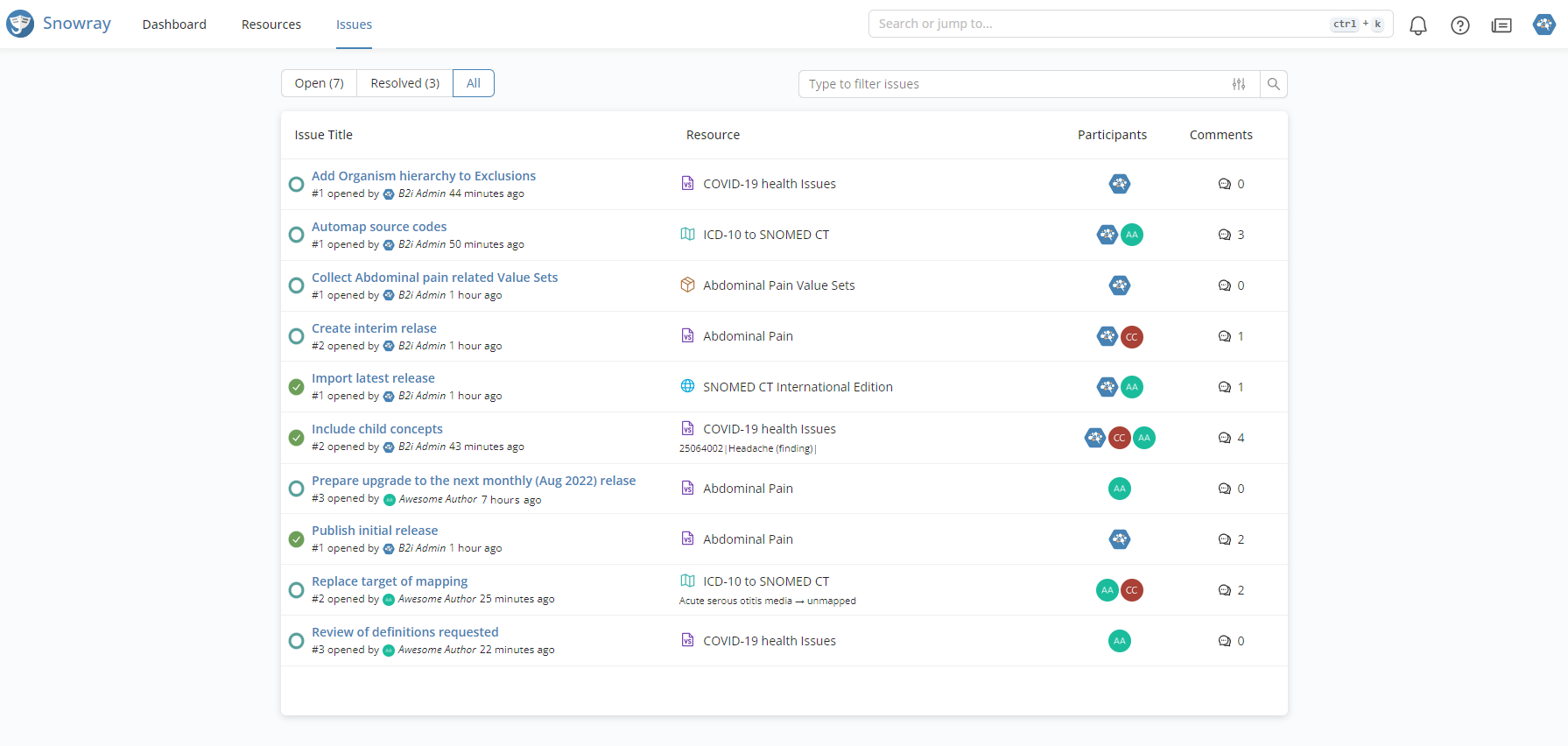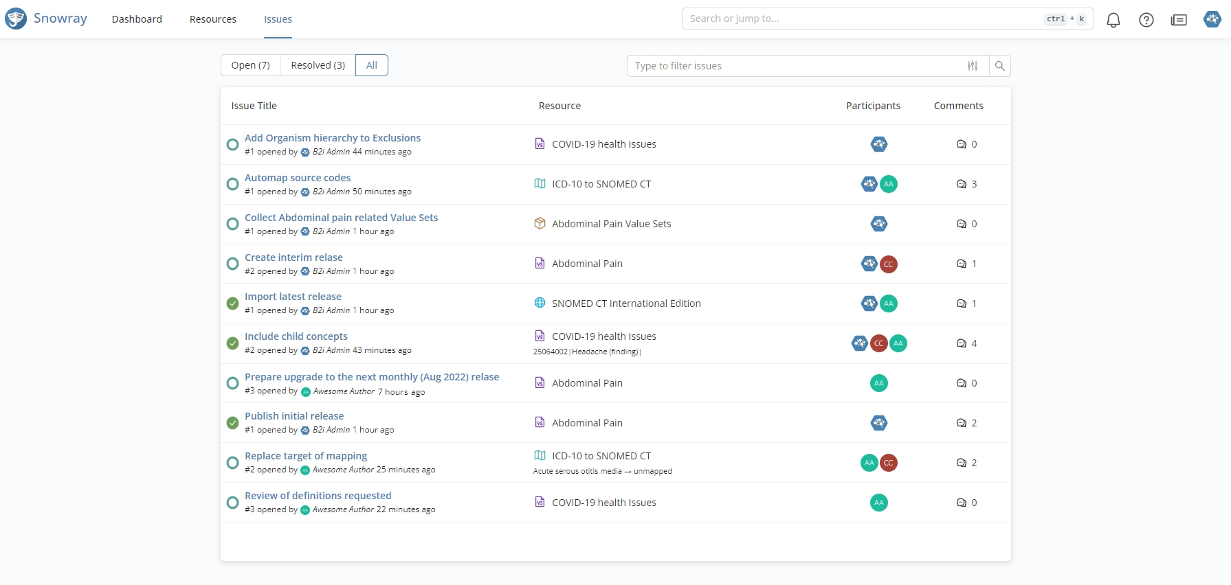 An Issues page is also available amongst the tabs of a resource, which is dedicated to the specific resource - let it be a Value Set, Code System, or a Bundle - and as a result, lists issues related only to the corresponding resource.