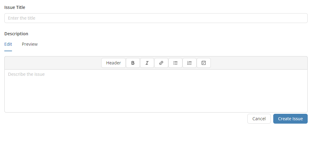 Issues are linked to and depend on resources, therefore the creation of an issue originates from the selected resource itself.