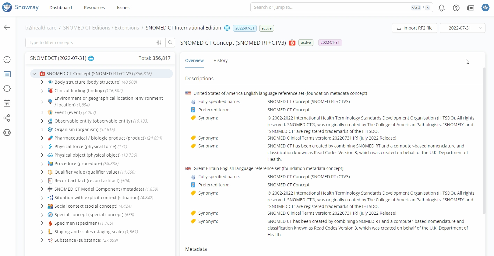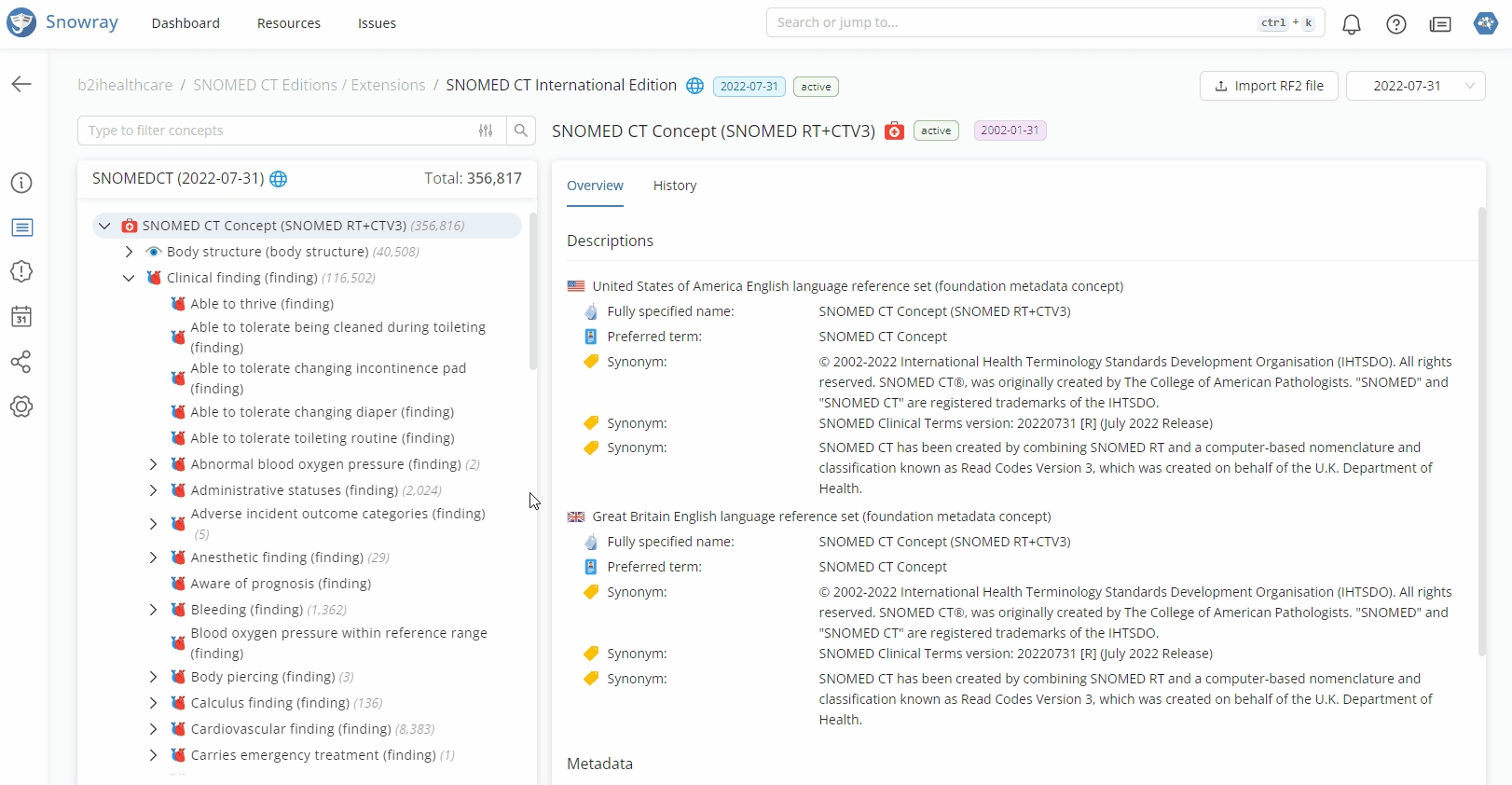 Besides supporting national and international Terminology Standards, such as SNOMED CT, ICD-10, or LOINC, Snowray also supports the creation and maintenance of Custom Code Systems.