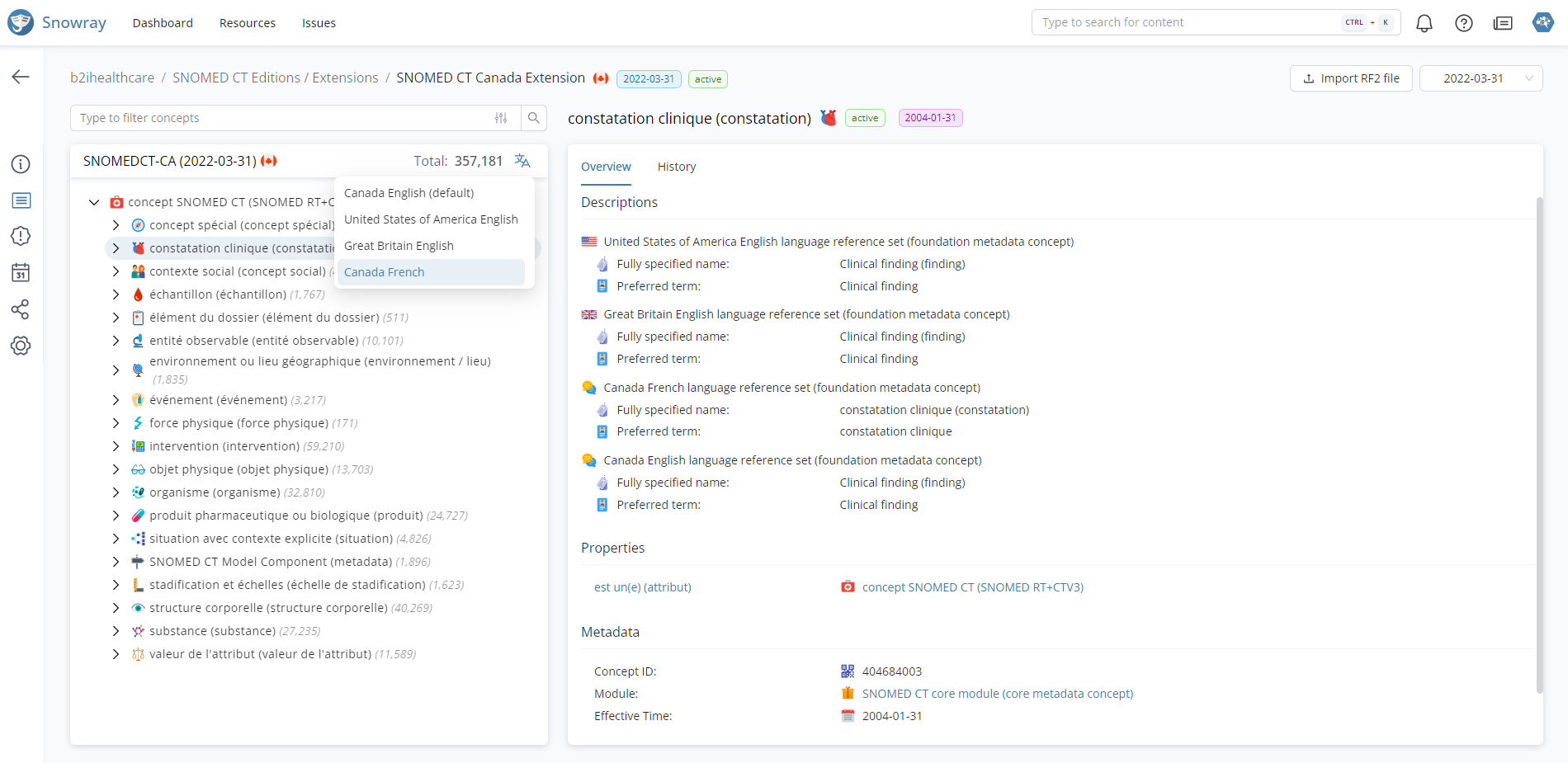 Additionally, when selected in the hierarchy, concepts will be displayed in the preferred language in the concept Overview tab header as well.