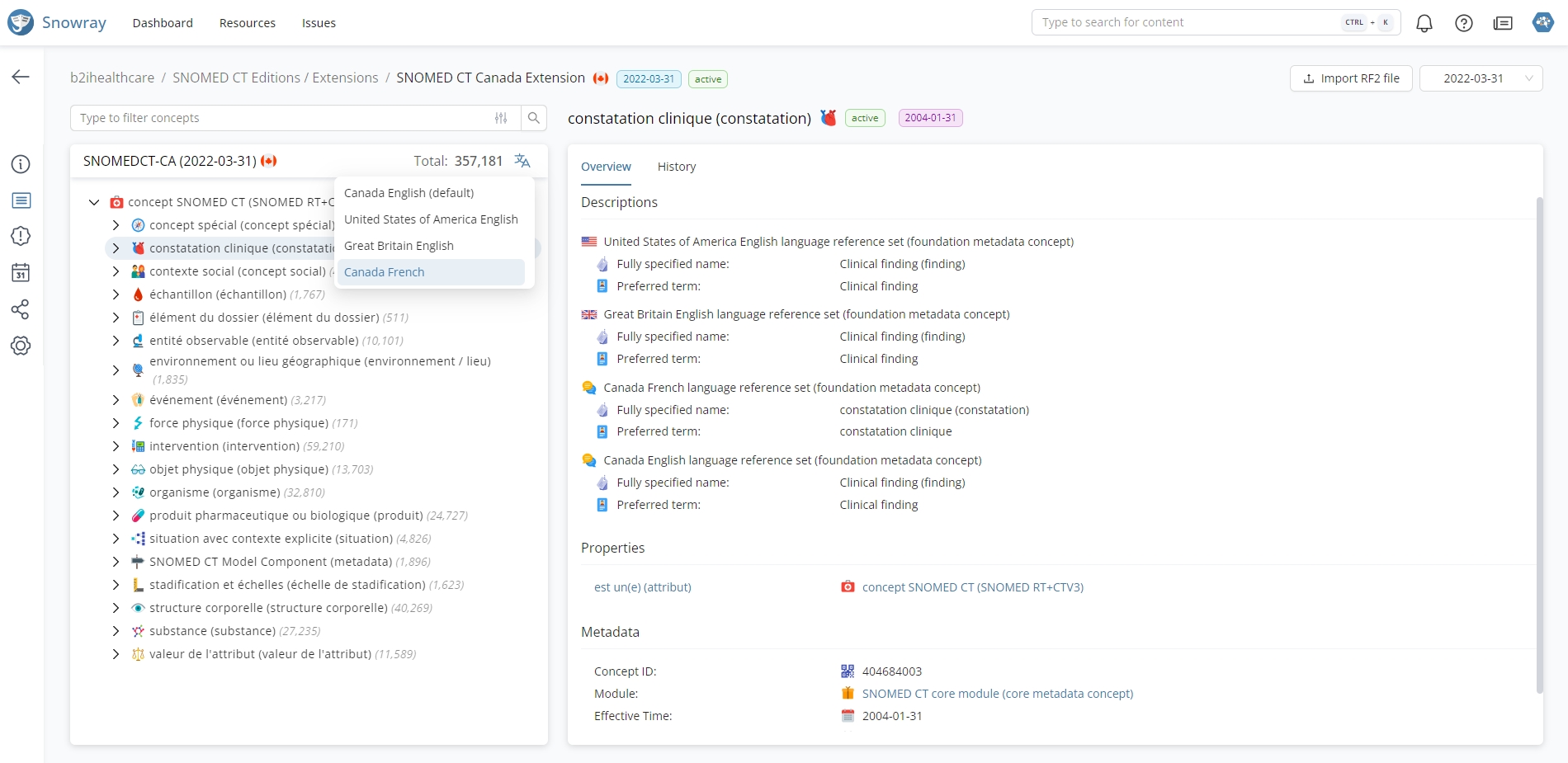 The language selector is accessible from the terminology tree, therefore, users can also change the display language of the terminology tree content when referenced in other resources, i.e. when serving as domains for Value Sets and Concept Maps.