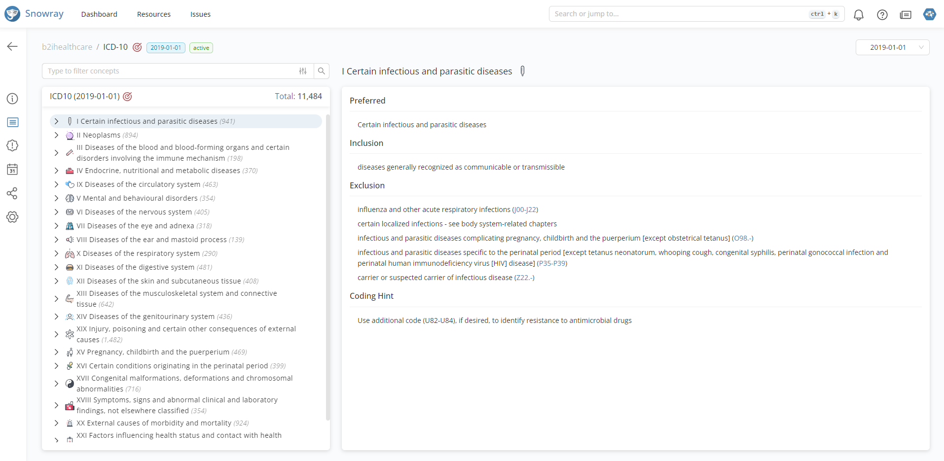 Snowray supports browsing the ICD-10 terminology by providing a fully functional Browser. The terminology is represented in a hierarchical view, where the content can be browsed by expanding the nodes. ICD-10 codes can also be searched by their terms or their IDs using the filter search at the top. Search results are displayed within the hierarchy and the selected concept details next to it.