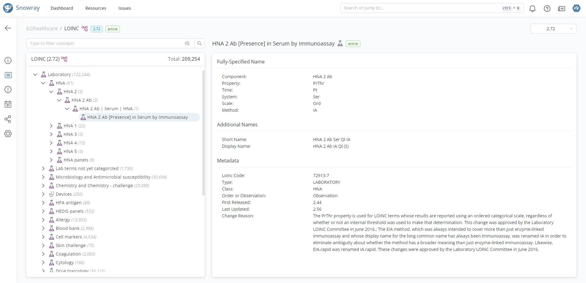A comprehensive Browser is available for LOINC within Snowray. The content is displayed in a tree view, where the terminology can be browsed manually by expanding the various nodes. LOINC codes can also be searched using the filter search at the top of the tree. Matching results can be examined in a flat list or in a hierarchical manner, while the details of the selected code are displayed on the right-hand side.