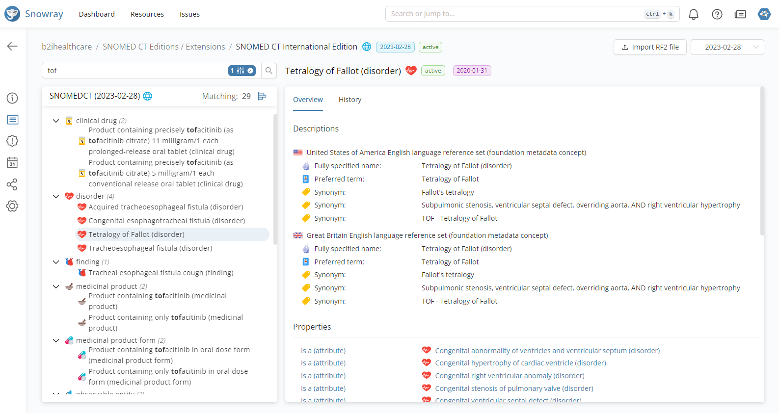 Snowray provides an advanced search option for SNOMED CT, which can be invoked by pressing the advanced filter icon in the search bar. This enables users to specify additional criteria to restrict their searches.