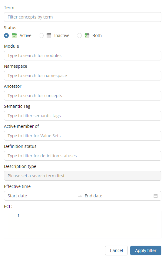 The filters above are mostly dropdowns, while the ECL filter requires typing in a valid query. A content assist, which can be activated by pressing Ctrl + Space , helps users to construct ECL queries easily.
