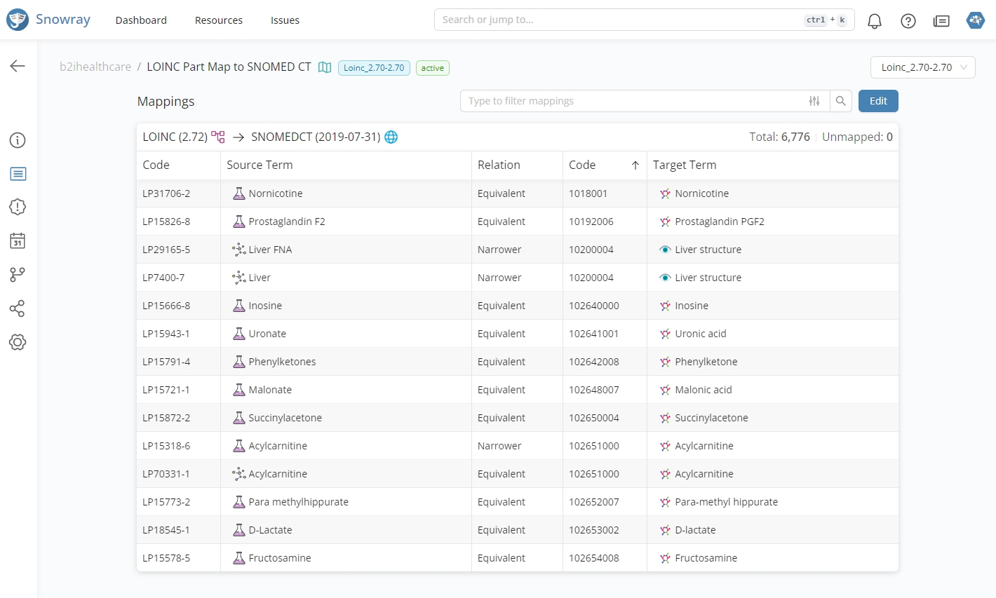 The table header advises users on the Source and Target Domains involved in the Concept Map, along with their versions. Besides the domain details, the header also displays information about the total number of mappings, as well as the number of unmapped concepts.