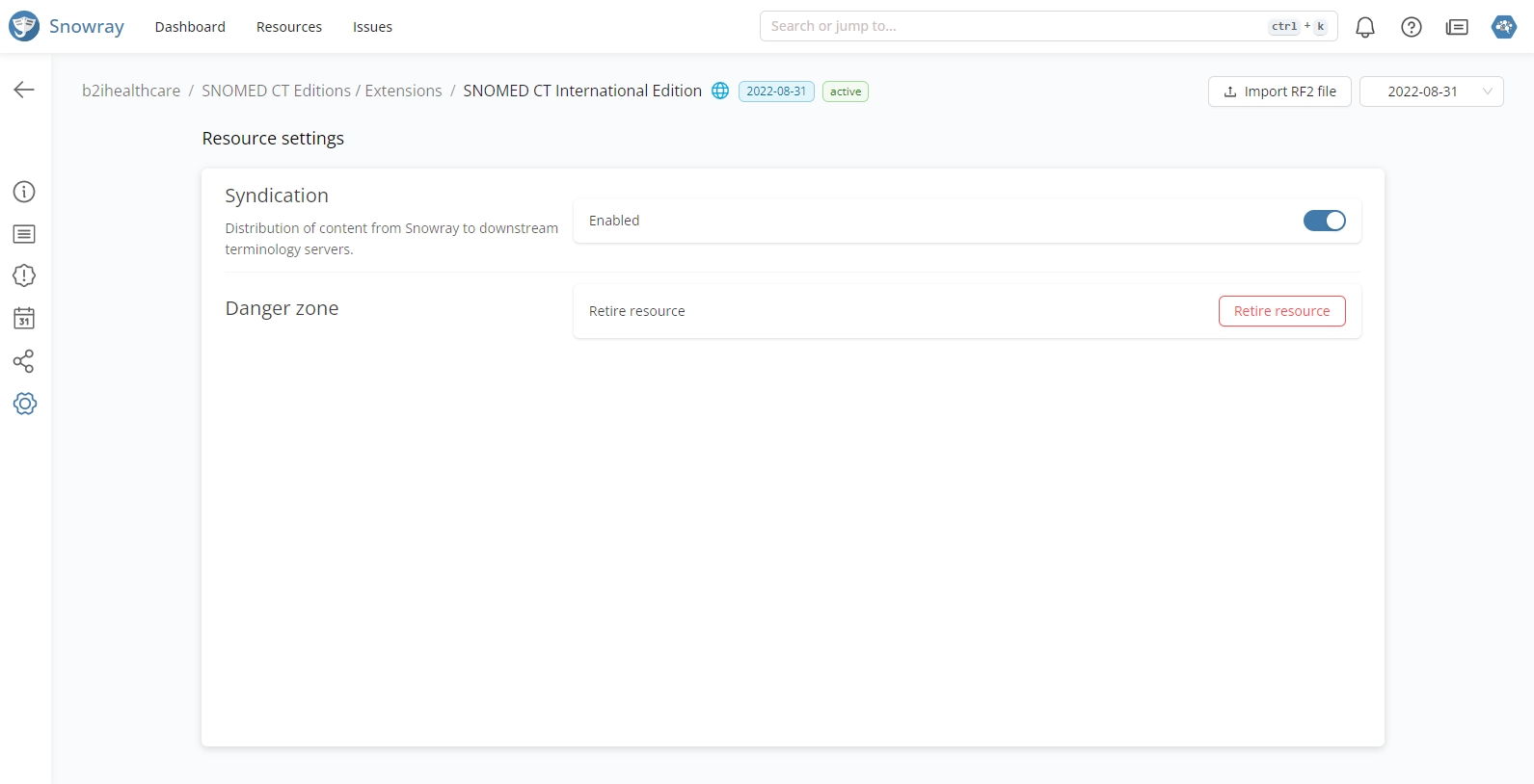 Syndication enables downstream terminology servers to receive updates from Snowray when a new release of a particular resource gets released. Follow this guide on how to connect a terminology server to the Snow Owl Terminology Server running behind Snowray.