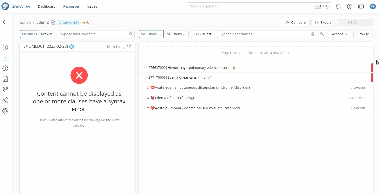 Value Sets might contain incorrectly constructed ECL queries, which are identified and flagged on the Content tab of the resource.