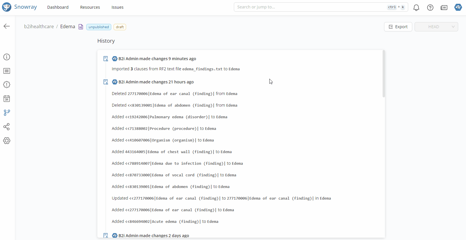 Users are allowed to restore Value Set content to a previous state. This action can be performed from the resource's History tab by hovering over a change commit and pressing the revealed button.